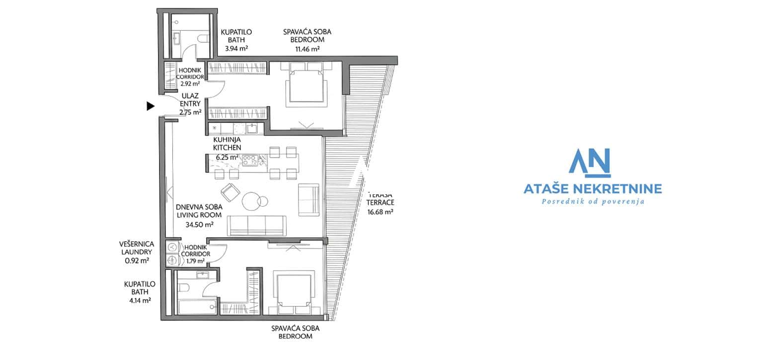 Cena: 492.800 € (4.400 €/m2) Kvadratura: 95.66m2+ terasa 16.68m2 >112 m2   Struktura: 3.0 (trosoban) Sprat: VI od IX