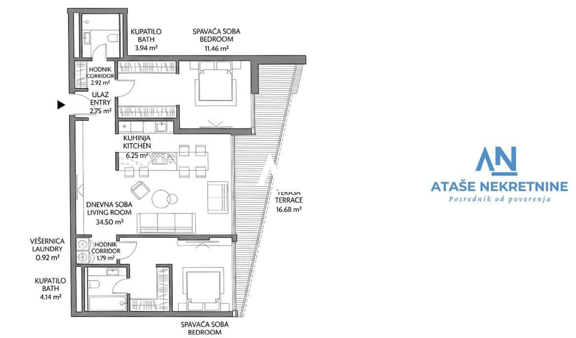 • Predsoblje, funkcionalni hodnik, dva kupatila.