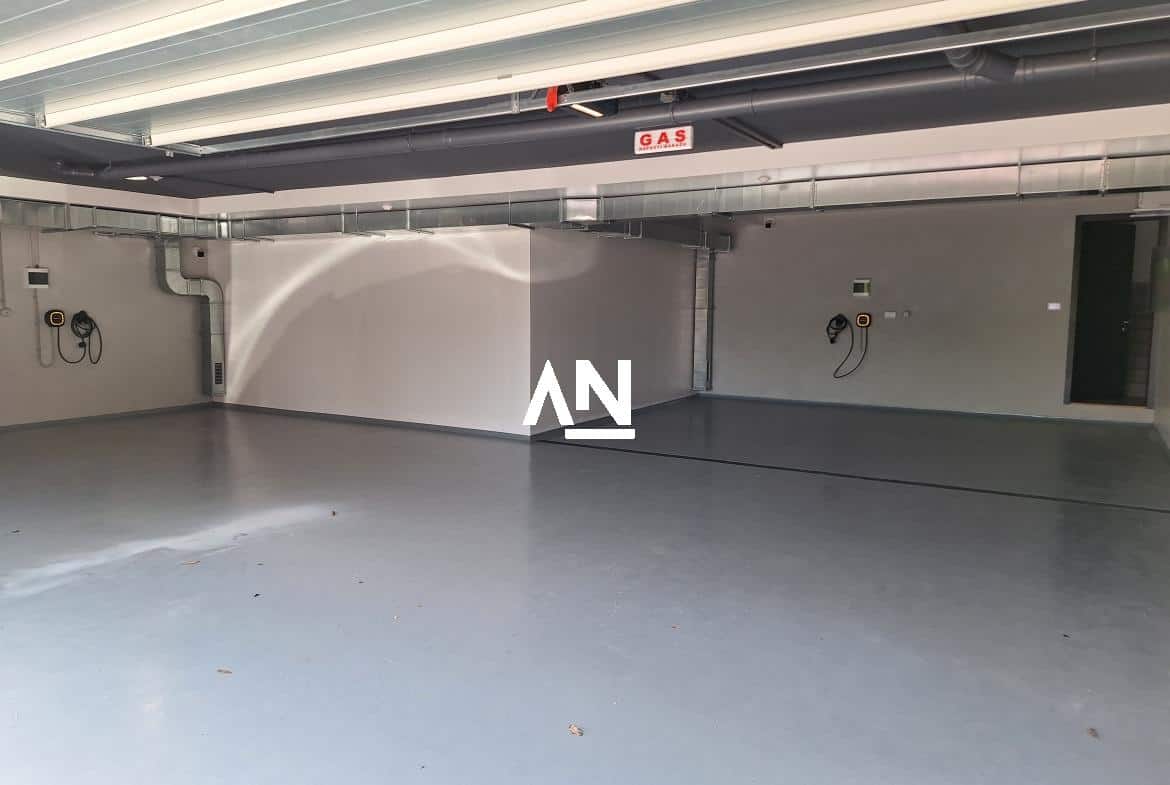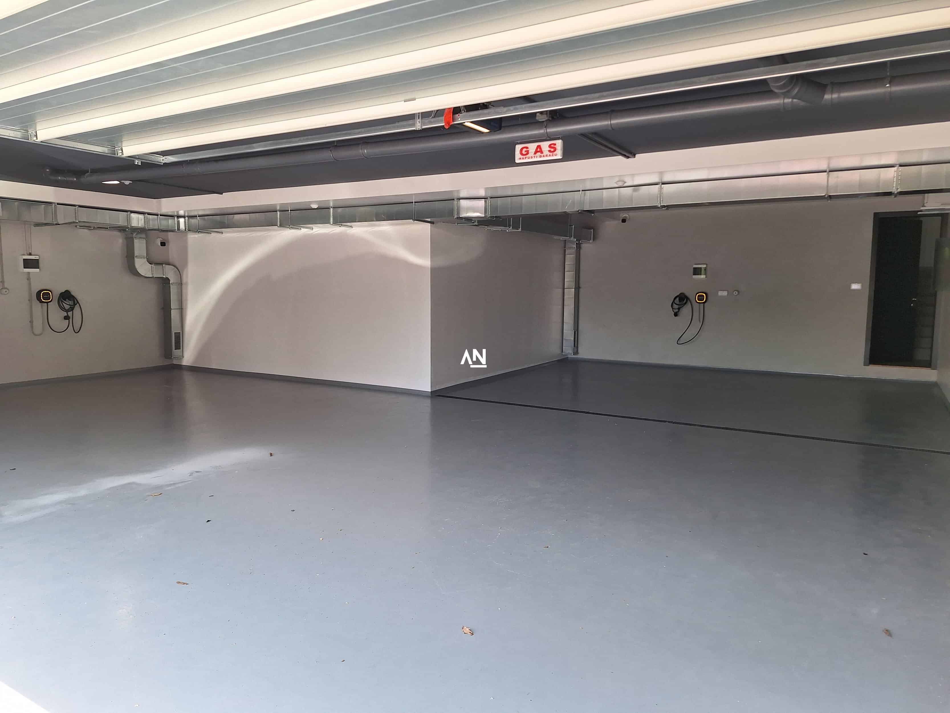 Svaka kuća poseduje dva garažna mesta, kao i dodatne ostave i podrumske prostorije.
